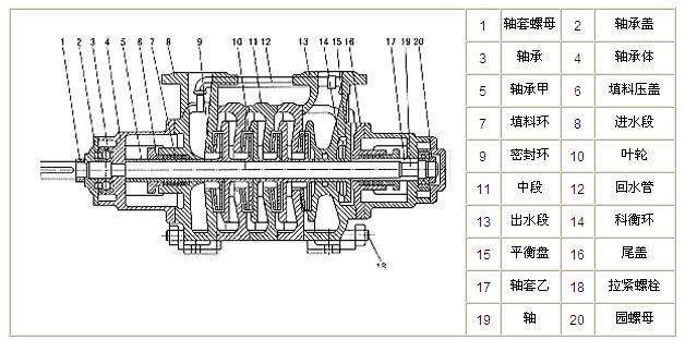 GC型水泵的主要零件有軸、軸套、進(jìn)水段、葉輪、導(dǎo)翼、密封環(huán)、中段、出水段、平衡環(huán)、平衡盤、尾蓋。