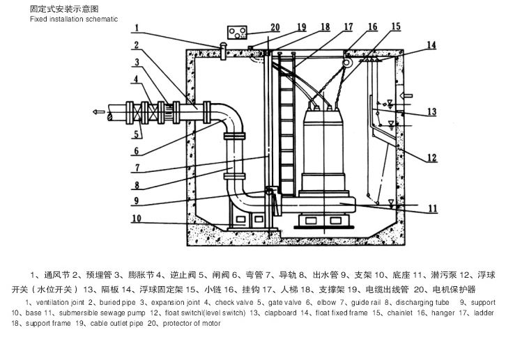 9、雙導(dǎo)軌自動(dòng)耦合安裝系統(tǒng),給泵的安裝、維修帶來(lái)極大的方便,人可不必為此進(jìn)入污水坑。