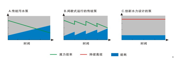 由于具有自清潔能力,隨著時(shí)間延長(zhǎng),創(chuàng)新水力設(shè)計(jì)的泵扔保持其高效率,這樣可以大程度地降低能源成本(圖C)